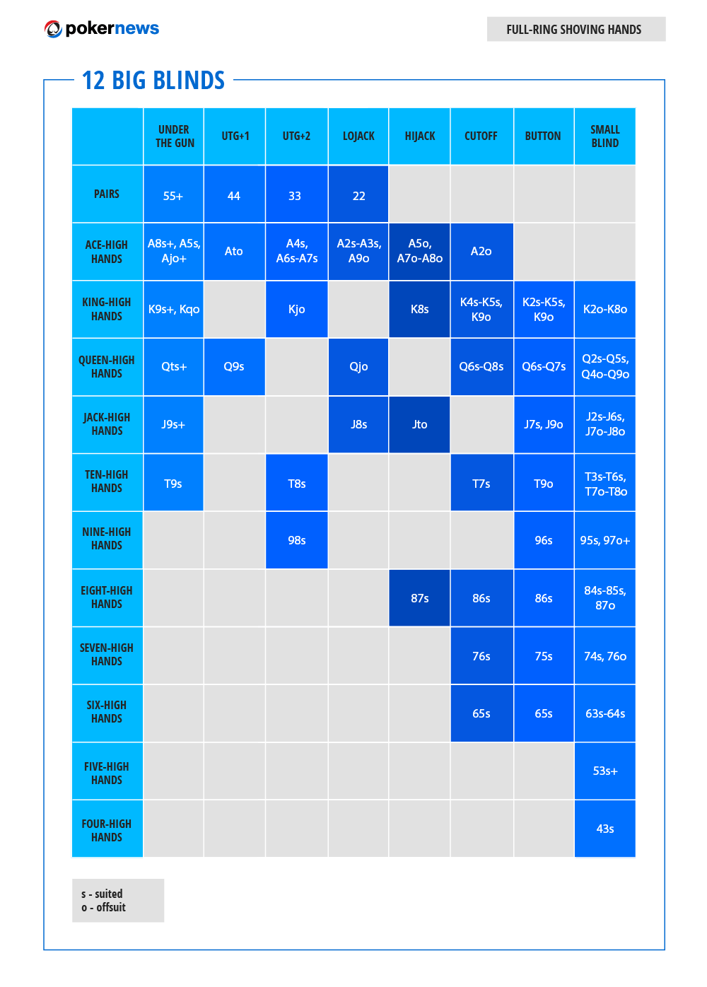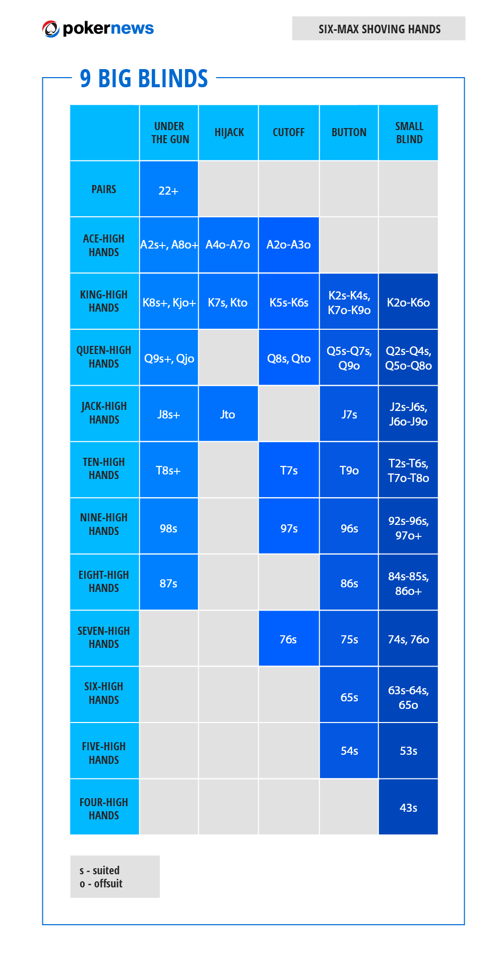 The biggest jumps in shoving range will come the closer you get to the big blind — i.e., the difference between shoving in the first two seats is far less than the difference in shoving between the button and small blind.