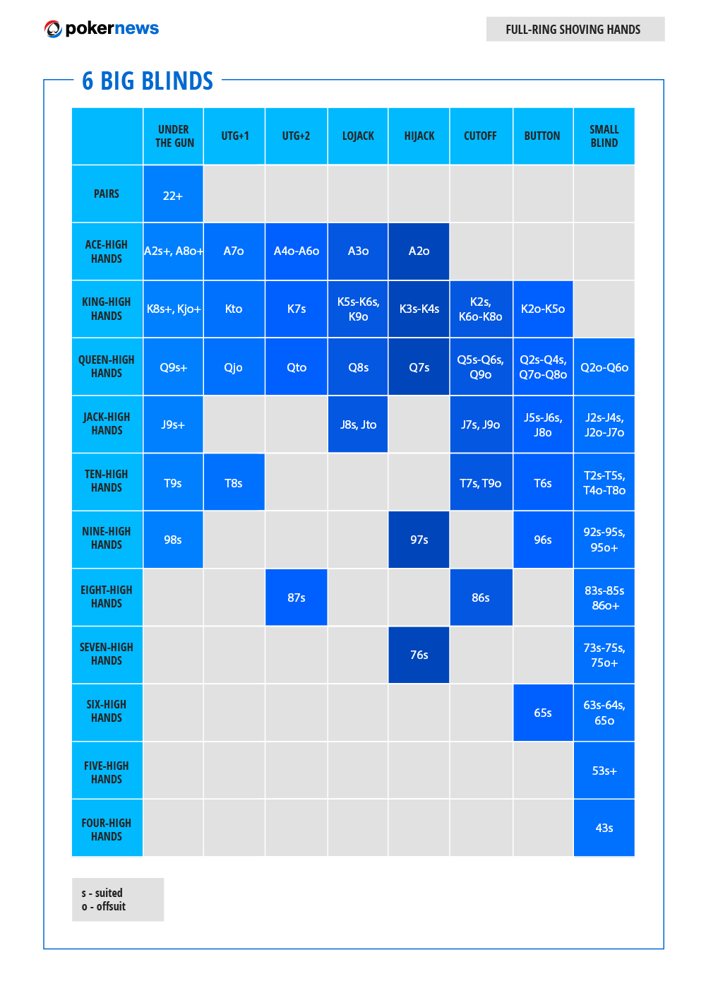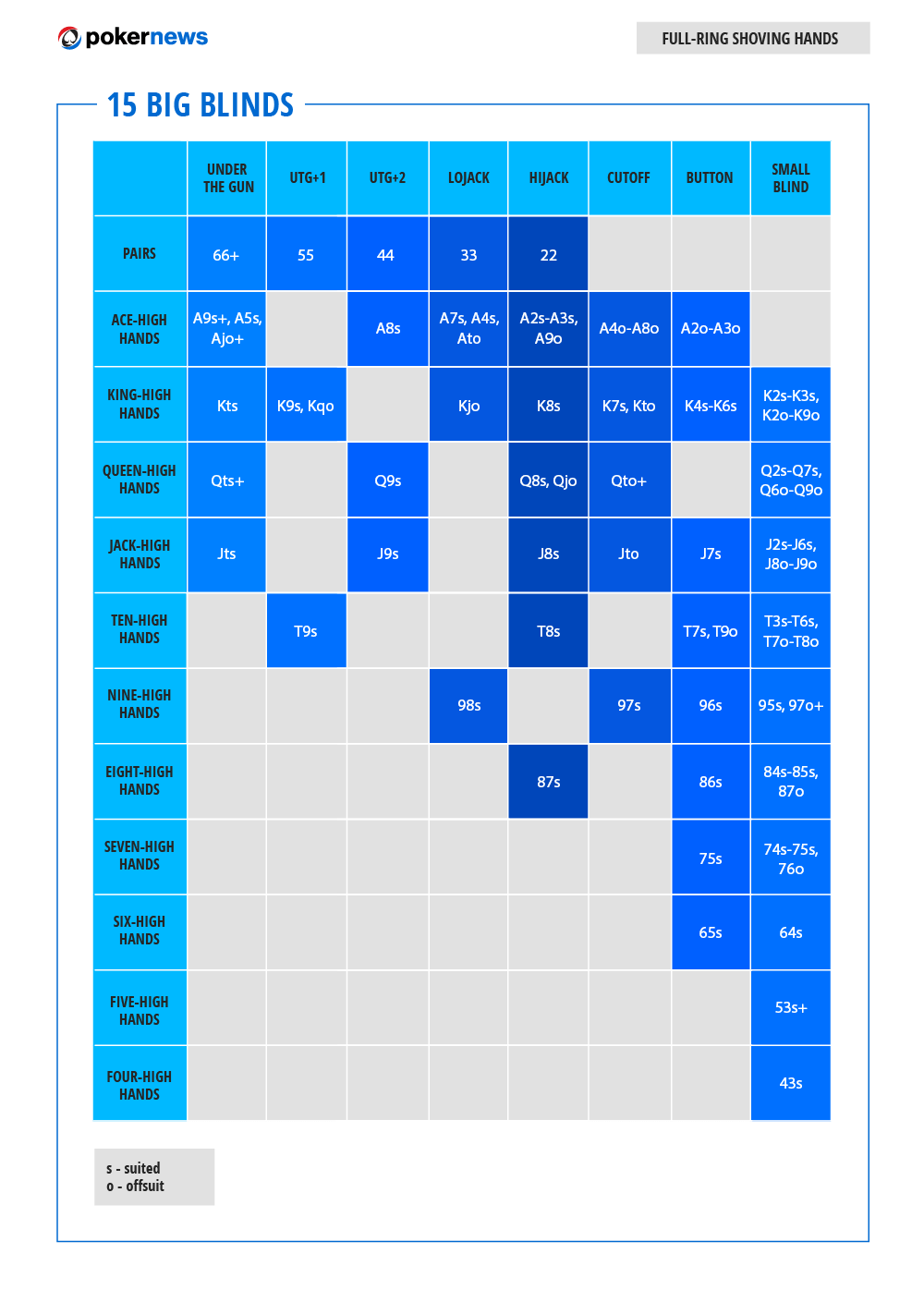 They're broken into two categories: full-ring ranges and six-max ranges. Each category features shoving hands for five different stack sizes, raised in increments of three big blinds.